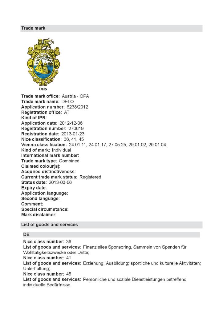 Die Delo-Marke hat die österreichische Registrierungsnummer AM 6238/2012.