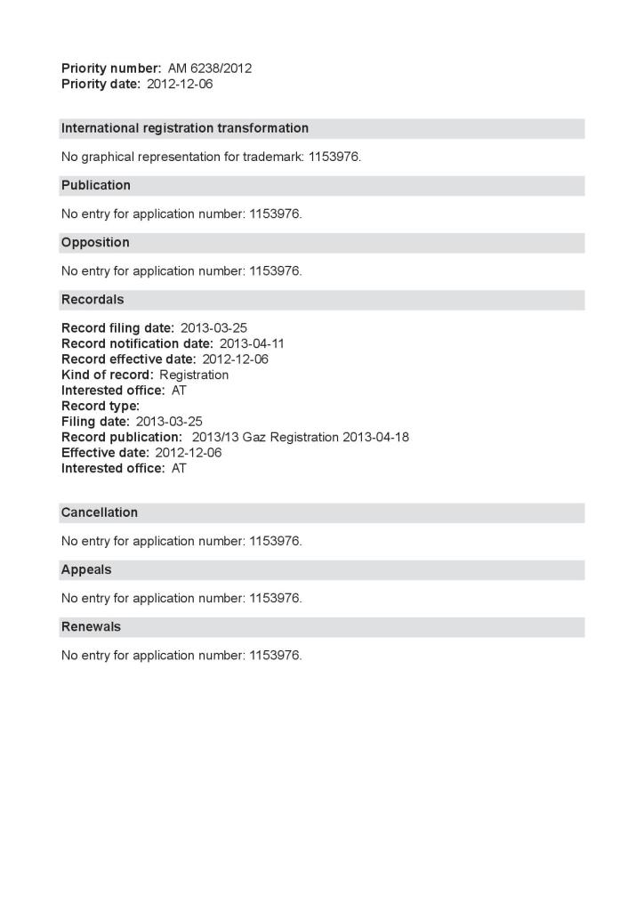 Der Antrag auf Weiterleitung des Gesuchs um internationale Registrierung der österreichischen Markenanmeldung AM 6238/2012 hat das Aktenzeichen IR 1149/2012 erhalten.